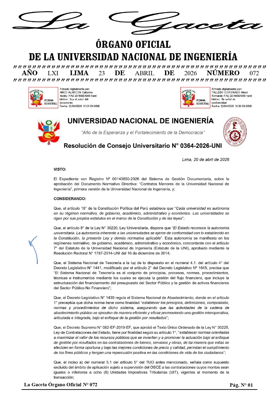 ÓRGANO OFICIAL DE LA UNIVERSIDAD NACIONAL DE INGENIERÍA